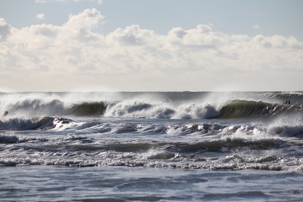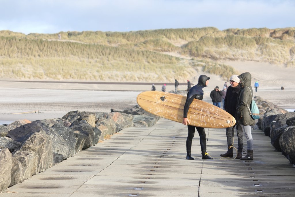 Wetter und Wellen waren am nächsten Tag wie bestellt. Es wehte ein kräftiger Wind aus Westen. Kein Regen in Sicht. Die Sonne wagte hinter den Wolken mal einen Blick auf die Wassersportler und Strandspaziergänger. Alle Wassersportgeräte lagen breit verstreut vor unseren Bullis. Alle, auch die Nicht-Wassersportler, fühlten sich auf ihre Weise irgendwie wohl und freuten sich auf den Strand, die Nordsee, auf die Begegnungen miteinander, auf die Bewegung, auf das Abenteuer, das Bier, den Kamin, das Abendessen und schließlich wieder auf das gemütliche Bett.